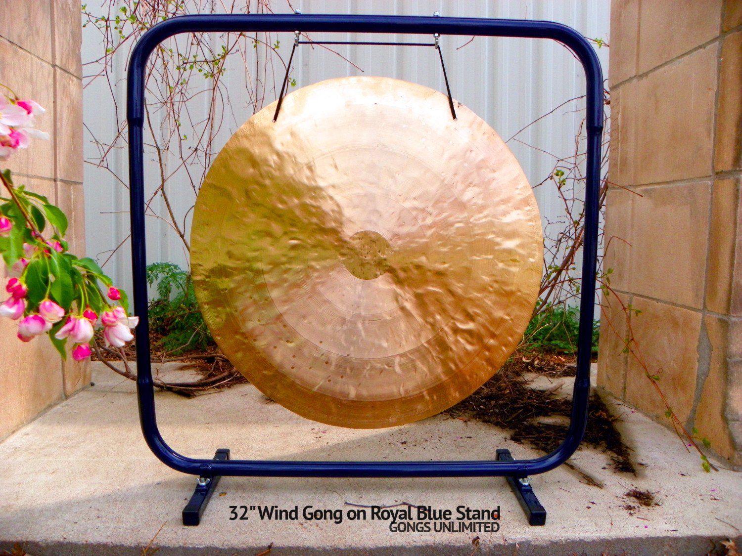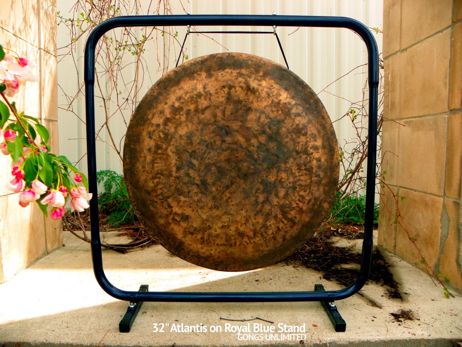 The Royal Blue Gong Stand is an environmentally conscious gong stand. We stepped in before the recycling of metal, or the junkyarding of it, and upcycled. We kept a bunch of metal from going to the scrapper. Each stand is constructed from two roll bars that we bought from a supplier to jeeps and dune buggies. The paint we waited for at a local car paint biz to have some extra from a batch that went on a modern Mustang. We kept this cool blue from being tossed out!